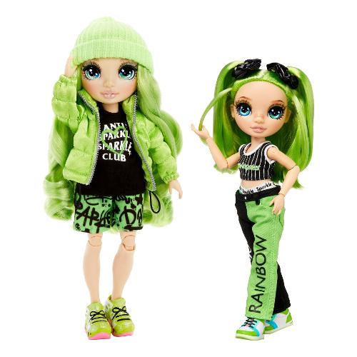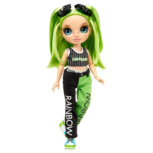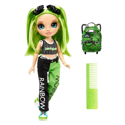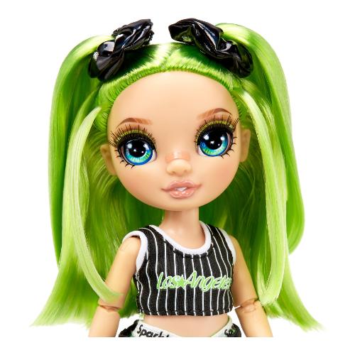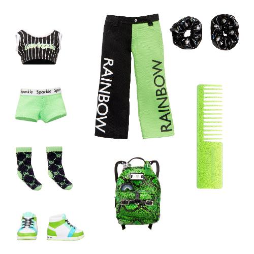 Jade è vestita di verde con un top sportivo a righe, pantaloncini verdi e neri e sneakers alte. Ha anche uno zainetto con un design in pelle di serpente e logo RH, perfetto per riporre i suoi accessori.