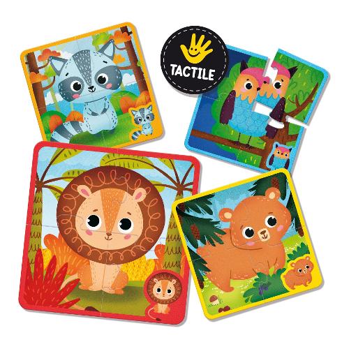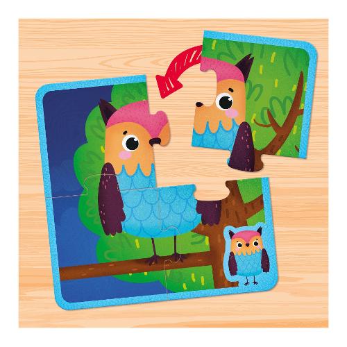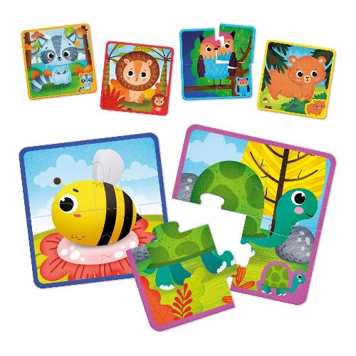 Sei allegri puzzle realizzati con materiali resisteti e sicuri, con elementi smerigliati, per esercitare la logica e sviluppare la sensibilità tattile. la confezione include 6 puzzle da 4 pezzi