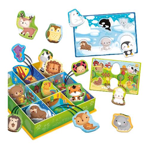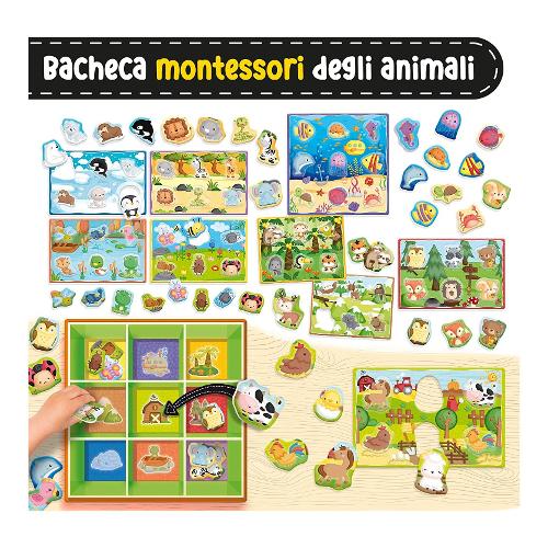 La classica bacheca ma tutta dedicata al mondo degli animali e dei loro ambienti. Un gioco di classificazione basato sul metodo montessori. Include bacheca 3d – 50 sagome autocorrettive
