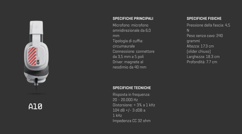 Migliora la tua attrezzatura da gioco quotidiana con la cuffia con microfono ASTRO A10 Gen 2 per PlayStation 5. Considerala l’evoluzione dei dispositivi per PlayStation 5 che usi già quotidianamente. L'audio esplosivo grazie ai driver dinamici da 32 mm, il microfono flip-to-mute e la costruzione solida con cuscinetti auricolari e l’imbottitura della fascia per la testa sostituibili si combinano per un'esperienza audio indimenticabile.