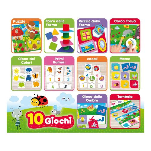 Una ricca collezione di giochi davvero educativi con cui sviluppare logica, manualità fine, vista, tatto e tanto ancora. Include: puzzle – puzzle delle forme – 8 cilindri – 8 forme geometriche – 20 tessere per le associazioni – cercatrova con 8 gettoni – 16 tessere memo – 2 cartelle