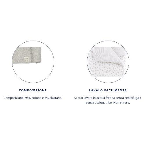 Sacco soffice per il portabebè convertibile in copertina. Reversibile è dotato di velcri per apertura risvolti laterali e una cerniera nella parte inferiore per trattenere i piedi del bambino ed evitare che si scopra.