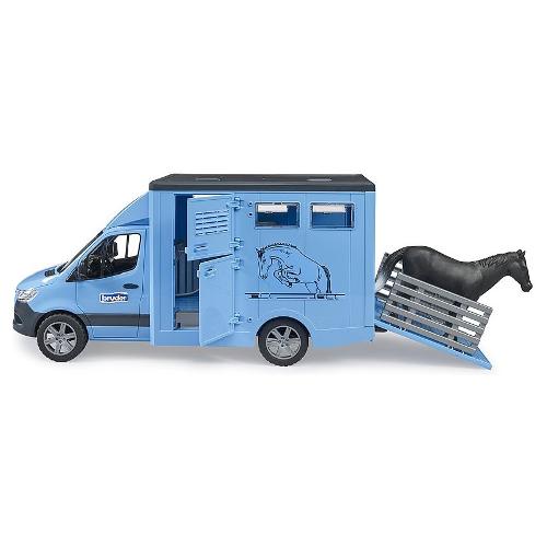 Il camion per il trasporto di animali dispone di un moderno allestimento per valigie specifico per specie con parete divisoria interna variabile e due abbeveratoi. Per caricare e scaricare i cavalli è possibile aprire la rampa; le griglie delle rampe assicurano una guida delicata degli animali all'interno e all'esterno del veicolo. Un cavallo in scala viene fornito già in dotazione; ulteriori cavalli sono disponibili con il codice articolo 02306. In questo veicolo possono essere trasportati al massimo due cavalli. La stalla dei cavalli bworld (n. art. 62506) si adatta perfettamente a questo furgone.