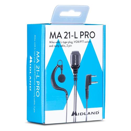 Microfono con connettore ad L, selettore VOX/PTT e cavo spiralato con presa 2 PIN Midland.