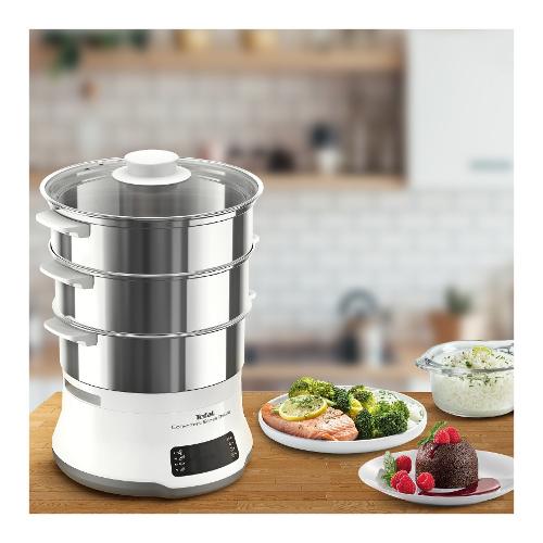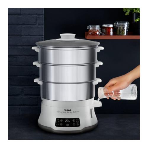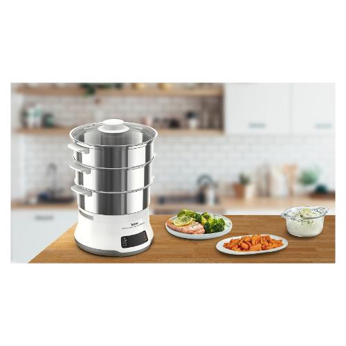 Prepara un pasto completo di 3 portate in una sola volta grazie alla comodità del sistema di cottura a vapore a più livelli. Fino a 45 minuti di cottura a vapore autonoma senza dover versare nuovamente acqua nel serbatoio, grazie alla sua grande capacità di 1.2 L. Il serbatoio dispone di un indicatore del livello dell'acqua visibile e può essere riempito mentre l'apparecchio è in funzione