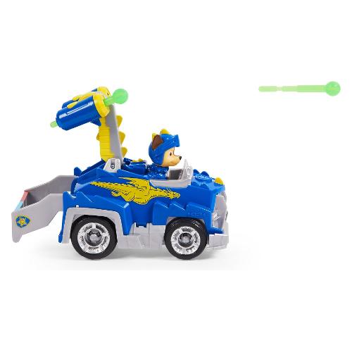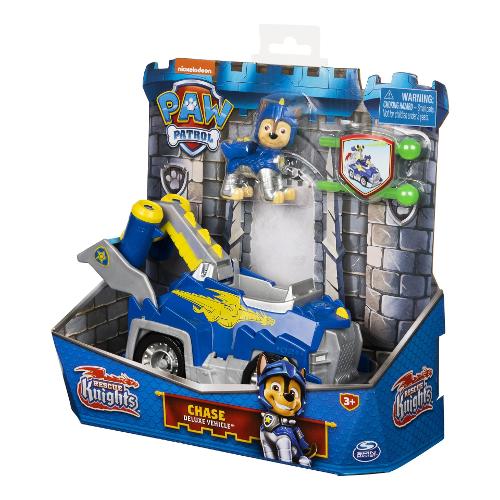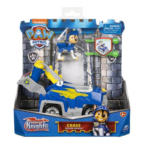 Collabora con Chase per emozionanti missioni con i suoi cavalieri PAW Patrol Rescue trasformando il veicolo Deluxe. Il veicolo di Chase presenta dettagli e stile ispirati al drago e un'emozionante trasformazione dello strumento di salvataggio. Orientato nella sua armatura Rescue Knights, Chase (action figure da collezione inclusa) è pronto a salvare la giornata a Barkingburg. Quando un amico drago è nei guai, metti Chase al volante e corri in soccorso. Spingere verso il basso sullo spoiler e un launcher si apre dal retro. Caricare i proiettili (due inclusi) e premere il pulsante per avviare. Esplora la tua immaginazione per creare fantastici salvataggi medievali, proprio come quelli del programma televisivo di successo.
