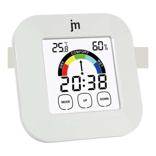 Termometro (°C/°F) e igrometro con indicazione dell’orario e funzione sveglia. Luce elettroluminescente. Rilevazione della temperatura e dell’umidità interne. Registrazione dei valori massimi e minimi di temperatura ed umidità. Indicazione del livello di comfort ambientale tramite grafico a colori. Funzione Touch Screen. Magnete, foro per il montaggio a parete e supporto da tavolo sul retro.