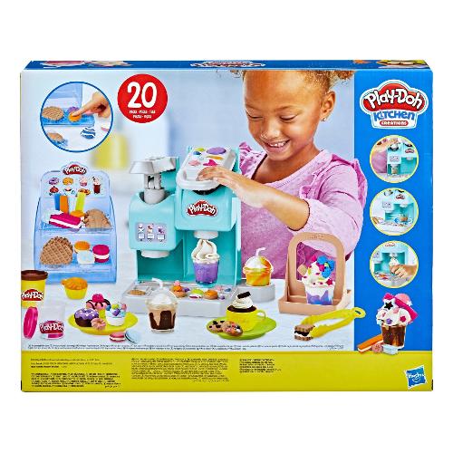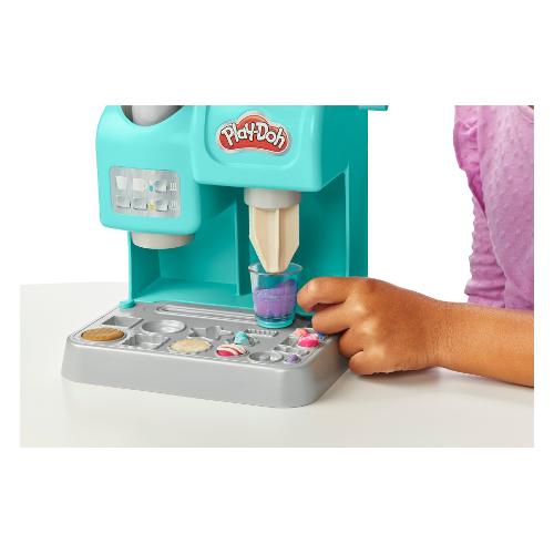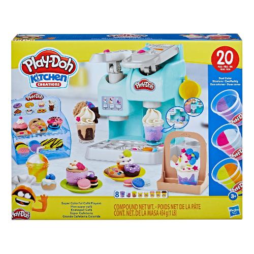 Dai libero sfogo all'immaginazione con il playset della Caffettiera Super Colorata! Questo set per giocare al bar permette a bambini e bambine di immaginare creative bevande Play-Doh a modo loro. Fai in modo che la macchinetta per il caffè giocattolo riempia le tazze con la colorata pasta modellabile Play-Doh, poi falle ruotare e scivolare fino all'area delle decorazioni e aggiungi la finta panna montata. Crea tanti colorati prodotti da forno Play-Doh con gli stampi per biscotti, cupcake e ciambelle ed esponili sul bancone trasparente. Che stiano preparando caffè, tè, frappè o finti frullati Play-Doh, giocando a fare il barista il divertimento per bambini e bambine è assicurato. Questo giocattolo Kitchen Creations per la creazione di bevande, pensato per bambini e bambine dai 3 anni in su, contiene anche 8 vasetti Play-Doh e 20 accessori per accendere l'immaginazione dei più piccoli. Hasbro, Play-Doh e tutte le proprietà correlate sono marchi commerciali di Hasbro.