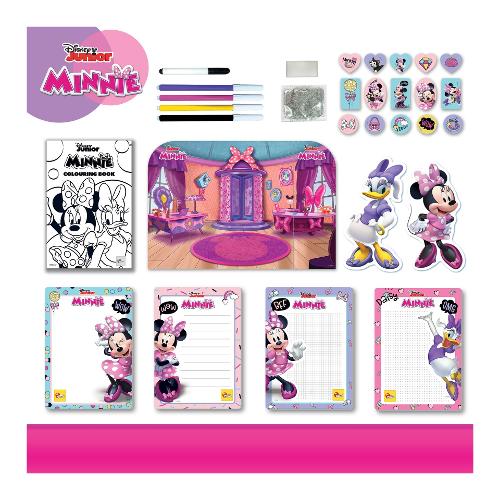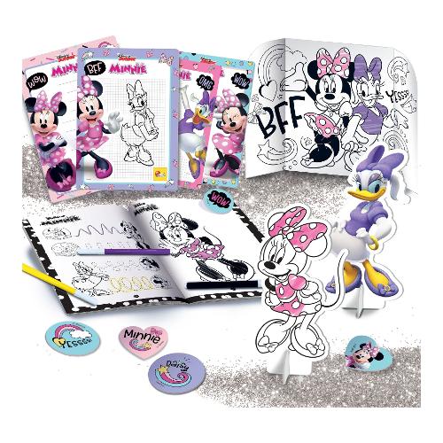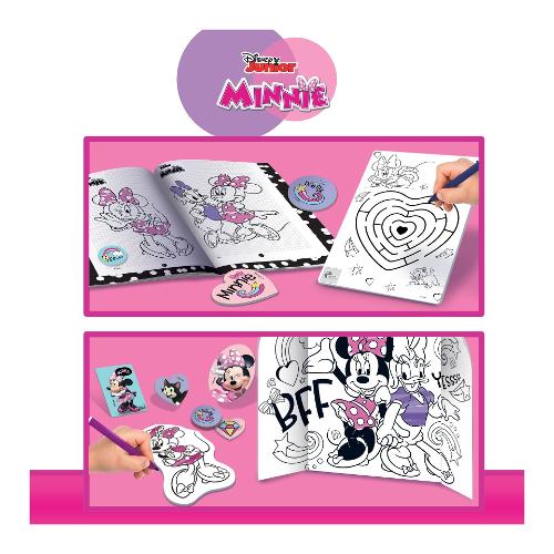 Un bellissimo kit creativo in un fantastico zainetto alla moda. Colora e disegna minnie e i suoi amici e crea tante storie con gli scenari forniti. Segui le indicazioni del quaderno operativo e decora le sue pagine con i pennarelli colorati e gli adesivi che trovi all’interno dello zainetto!