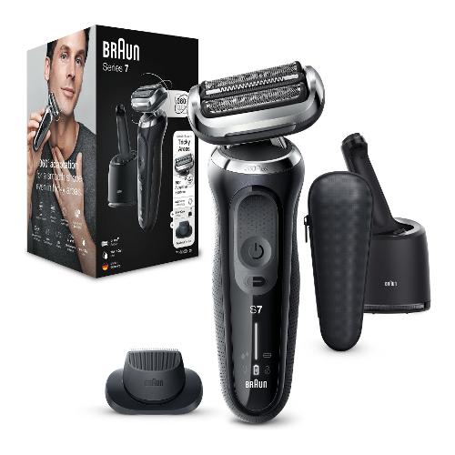 Rasoio elettrico Braun Series 7 da uomo con regolazione a 360° per una rasatura perfetta. Dotato della tecnologia AutoSense che rileva lo spessore della barba e regola la potenza del motore per rimuovere ancora più peli ad ogni rasatura. La batteria agli ioni di litio garantisce un'autonomia fino a 3 settimane e una ricarica rapida di 5 minuti, sufficienti per un'applicazione.
