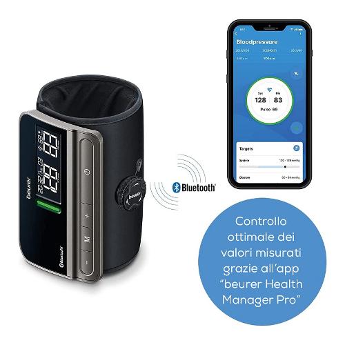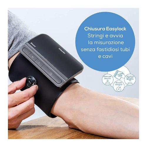 L'innovativo sistema easyLock facilita l'applicazione del dispositivo al braccio, garantisce una perfetta aderenza e una tenuta sicura, senza chiusura a strappo. I valori misurati possono essere comodamente trasmessi all'app "beurer HealthManager Pro" e monitorati a lungo termine. La soluzione all-in-one per la vostra salute! Con manicotto per circonferenze braccio di 24-40 cm