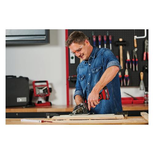La mini sega circolare a batteria TE-CS 18/89 Li – Solo è compatta, leggera e facile da usare - comoda da maneggiare. Come membro della famiglia Power X-Change, la mini sega circolare portatile può essere utilizzata in combinazione con ogni batteria ricaricabile PXC. La batteria e il caricabatterie della serie PXC non sono inclusi nella fornitura e sono disponibili separatamente. La profondità di taglio può essere regolata senza attrezzi. Anche la sostituzione della lama è semplice grazie al sistema di bloccaggio del mandrino. La lama in metallo duro e il fermo parallelo assicurano tagli puliti e precisi La profondità di taglio è di 28 mm. Il platorello di alta qualità in alluminio offre una stabilità ottimale.