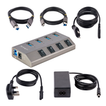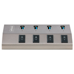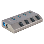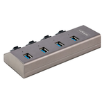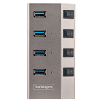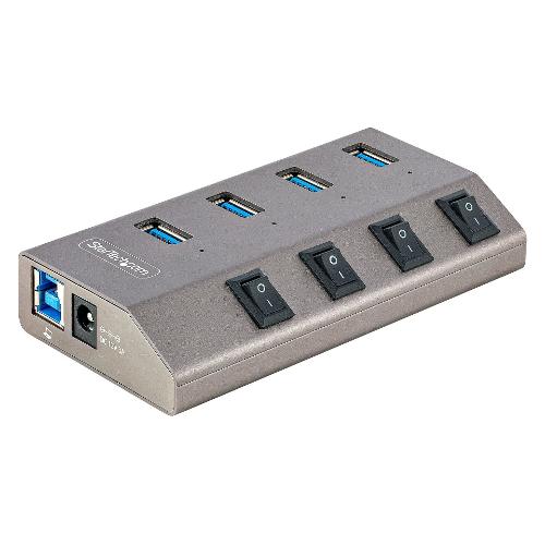 Questo Hub USB Autoalimentato a 4 porte USB 3.2 Gen 1 (5Gbps) con interruttori individuali On/Off aggiunge quattro porte USB Type-A a un computer, con il vantaggio che ogni porta dispone di un interruttore on/off individuale. L'hub USB è autoalimentato grazie all'alimentatore incluso. Si collega a una porta USB-A o USB-C di un computer portatile o desktop.
