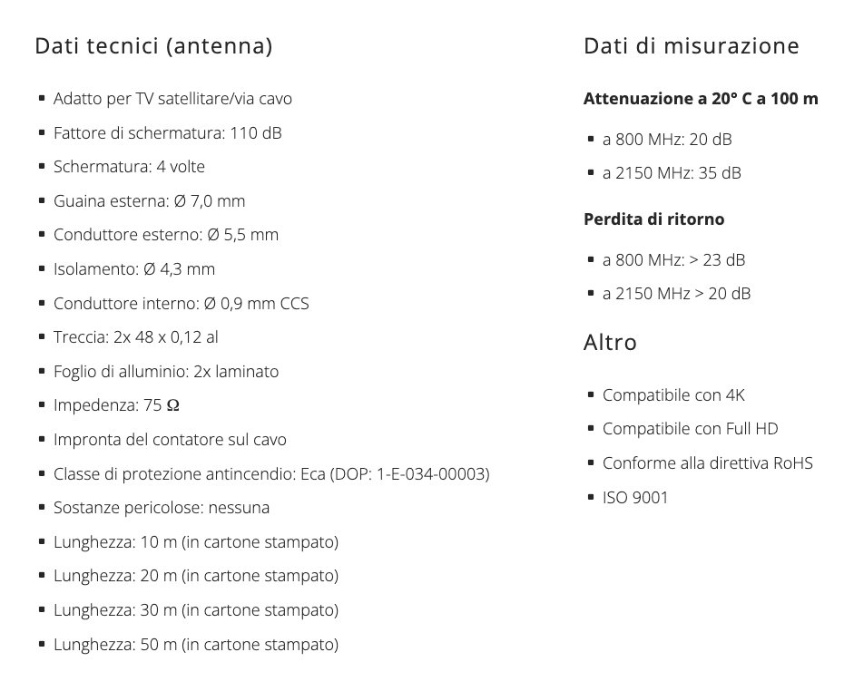 I cavi coassiali Megasat soddisfano i requisiti più elevati e combinano eccellenti proprietà elettriche con un grado di schermatura particolarmente elevato. Il cavo è conforme alla classe di protezione antincendio Eca ed è privo di sostanze inquinanti pericolose: ideale per un utilizzo sicuro in ambienti interni. Include due connettori F e un passacavo in gomma.