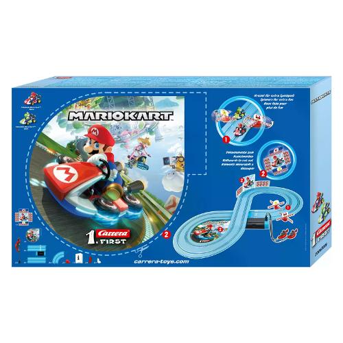 Set carrera first mario karttm con 2 veicoli inclusi nel set: mario karttm - mario e mario karttm - yoshi rotatoria per un divertimento extra, lunghezza della pista: 2,4 m , comandi manuali ergonomici creati appositamente per le mani dei bambini, tempo di gioco fino a 6 ore , elementi decorativi specifici in base al tema