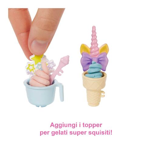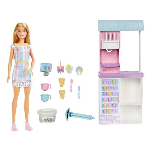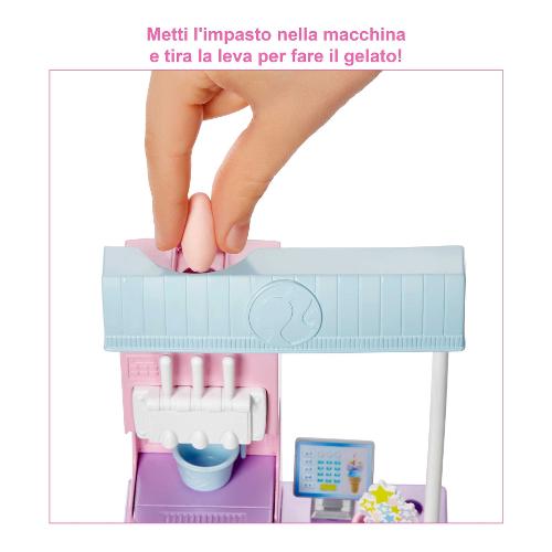 Vivi l'esperienza di gestire una gelateria con il playset gelateria di barbie®! I bambini adorano i gelati e con questo playset non solo possono gestire una gelateria, ma anche preparare squisiti coni gelato. Il playset include la bambola barbie® gelataia (alta 30,4 cm) che indossa un grazioso abito con stampa a tema e un grembiule a righe, una postazione per il gelato e accessori. I bambini possono utilizzare due tipi di pasta modellabile (rosa o blu) da mettere nella macchina per il gelato, tirare la levetta e vedere il 'gelato' fuoriuscire come nelle gelaterie vere! Poi basta mettere il gelato nelle coppette o nei coni e decorare il tutto con i topper! Prima di uscire, fai pagare i clienti alla cassa. Il playset include la bambola barbie®, una postazione per il gelato, pasta modellabile in 2 colori, 2 coppette, 2 coni, 3 topper, 2 cucchiaini, un porta-coni e un registratore di cassa. La bambola non può reggersi in piedi da sola. Colori e decorazioni possono variare.