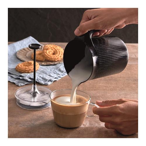 Metti il latte, anche freddo da frigo nel contenitore, inserisci nel microonde per farlo scaldare. Aggiungi coperchio e filtro, in pochi secondi ottieni una crema soffice, densa e golosa, come quella del bar.
