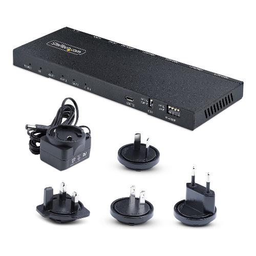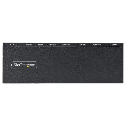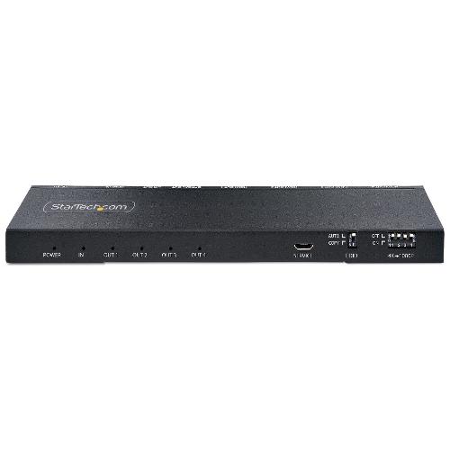 Questo splitter HDMI a 4 porte con scaler incorporato collega una sorgente video HDMI a quattro schermi HDMI, con supporto per risoluzioni UHD 4K, HDR (High Dynamic Range) e audio a 7.1 canali.