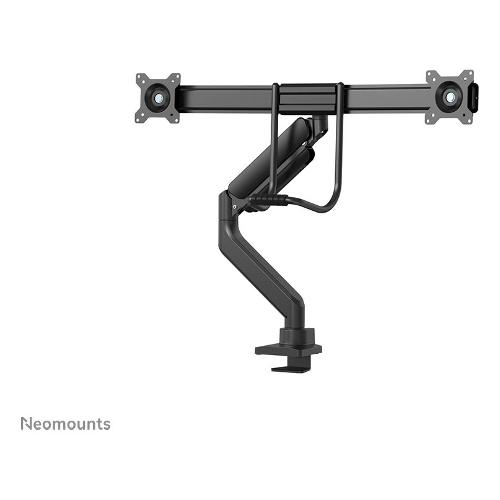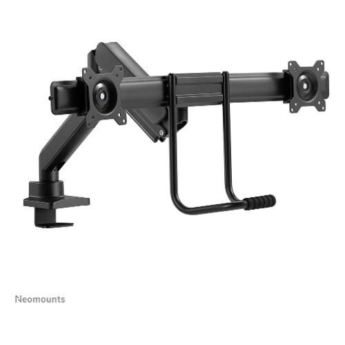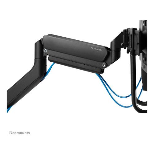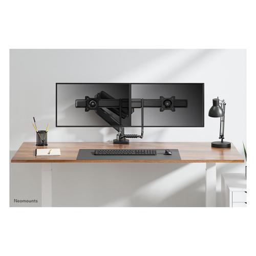 Il Neomounts by Newstar DS75-450BL2 è un supporto da scrivania full motion per due schermi piatti fino a 32" con una capacità massima di peso di 8 kg per schermo. La versatile tecnologia di inclinazione (20°), rotazione (360°) ed oscillazione (20°) consente di cambiare l'angolo di visione per sfruttare appieno le capacità degli schermi. Inoltre, il supporto è dotato di molla a gas per la regolazione dell'altezza (27,7-56 cm) e della profondità (0-50,5 cm), per creare la posizione di lavoro perfetta. Il DS75-450BL2 è dotato di un ingegnoso meccanismo di arresto a 180°, che consente di regolare in modo sicuro il supporto anche quando è posizionato vicino a una parete o a un pannello di separazione, senza entrare in contatto con la parete. L'intelligente sistema di gestione dei cavi assicura un instradamento ordinato degli stessi.