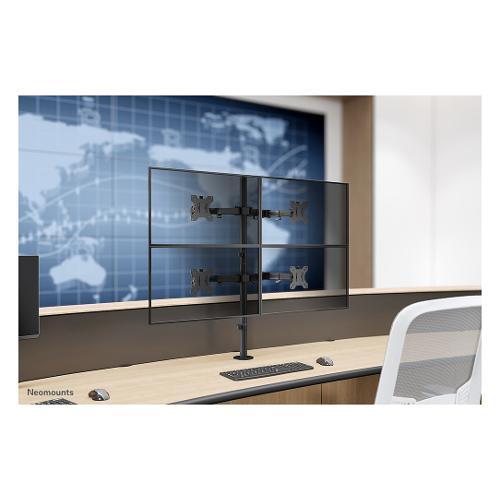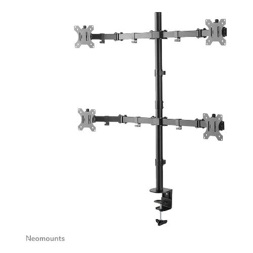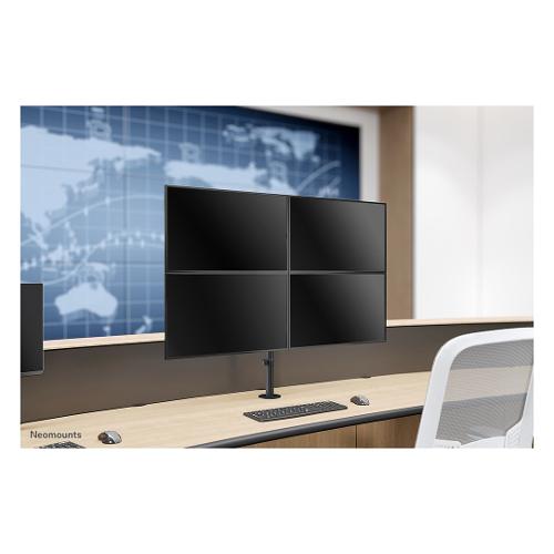 Il Neomounts by Newstar FPMA-D550D4BLACK è un supporto da tavolo full motion per quattro schermi piatti fino a 32" con una capacità di peso massima di 6 kg. Grazie alla versatile tecnologia di inclinazione (90°), rotazione verticale (360°) e rotazione orizzontale (180°), il supporto da tavolo può essere regolato in base a qualsiasi angolo di visione desiderato e sfruttare appieno le capacità dello schermo piatto. Inoltre, il supporto ha una regolazione in altezza (0-85,7 cm) e una regolazione in profondità (0-38,2 cm) per creare la perfetta situazione di lavoro. Le clip intelligenti per la gestione dei cavi assicurano un percorso chiaro dei cavi. Inoltre, il supporto a parete è dotato di un Easy-release VESA, con il quale è possibile (s)montare il monitor in un batter d'occhio.