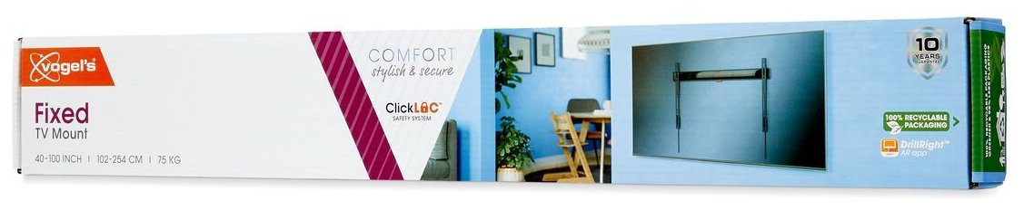 Design e sicurezza vanno di pari passo con il supporto a parete per TV COMFORT Fixed. La tua TV è montata piatta contro la parete, come un quadro. Lo spazio tra la parete e la TV è di soli 2,2 cm. Il supporto a parete è adatto a TV da 40 a 100 pollici con peso fino a 75 kg.