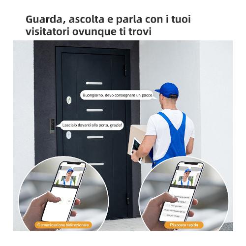 Registra ogni visita e custodisci tutti i momenti. La batteria ricaricabile da 6200 mAh garantisce che il campanello della porta duri fino a 6 mesi. Grazie alla certificazione IP65, il campanello può essere utilizzato all'aperto in diverse condizioni meteorologiche.