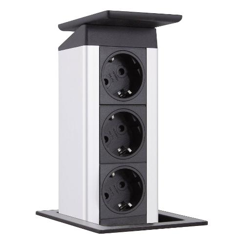 Torretta a scomparsa in alluminio con prese elettriche. Può essere facilmente aperta con il semplice tocco di un dito utilizzando la funzione push-to-open. Il coperchio oscillante brevettato impedisce che i cavi si inceppino durante la chiusura.