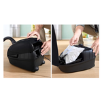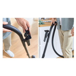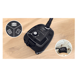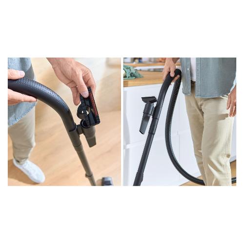 Potente aspirapolvere con sacco progettato con parti in plastica riciclata, potenza regolabile e comoda clip per riporre gli accessori.