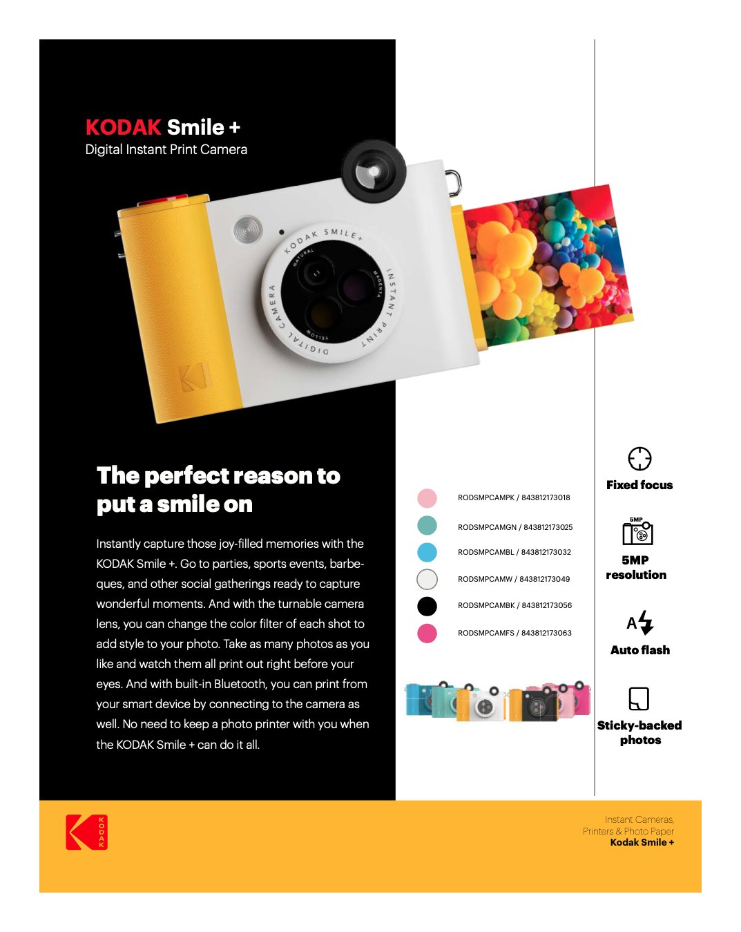 Catturate istantaneamente quei ricordi pieni di gioia con KODAK Smile +. Andate a feste, eventi sportivi, barbeques e altri incontri sociali pronti a catturare momenti meravigliosi. Inoltre, grazie all'obiettivo ruotabile, è possibile cambiare il filtro colore di ogni scatto per aggiungere stile alla foto. Scattate tutte le foto che volete e guardatele stampate davanti ai vostri occhi. Inoltre, grazie al Bluetooth integrato, è possibile stampare dal proprio dispositivo smart collegandolo alla fotocamera. Non c'è bisogno di tenere con sé una stampante fotografica quando KODAK Smile + può fare tutto.