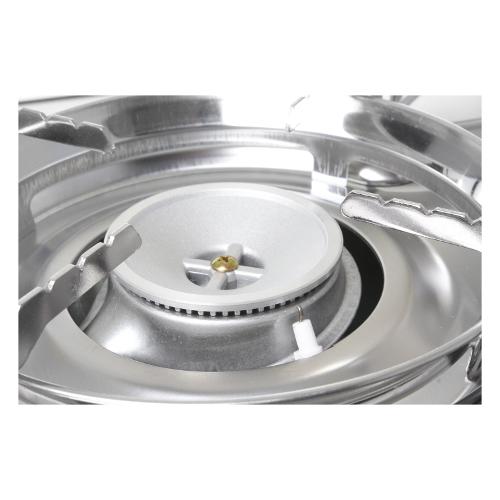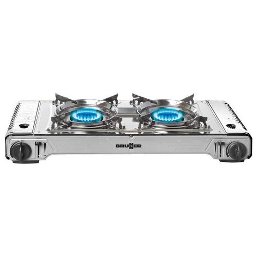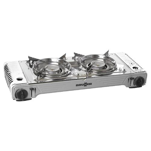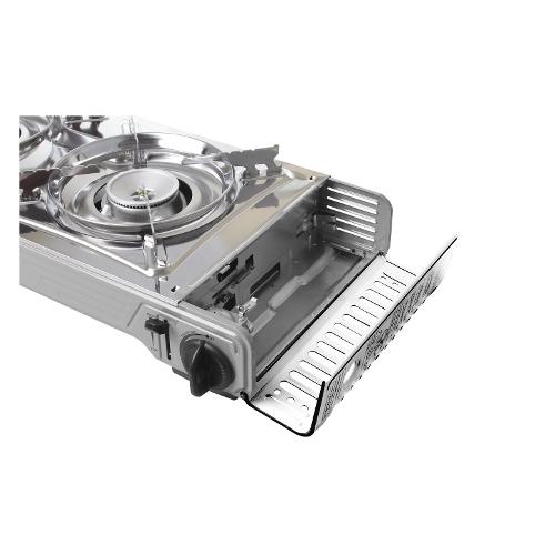 Fornello gas a cartuccia a 2 fuochi realizzato in acciaio inox e con piastra grill in fusione di alluminio.