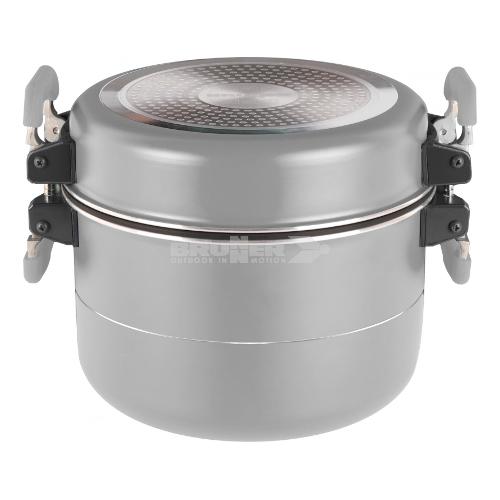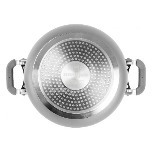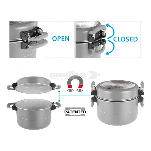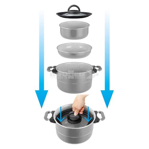 Composizione: pentola d.22 cm (4,9 lt), casseruola 18 cm (1,7 lt), tegame 20 cm (1,2 lt), tegame con 2 manici 22 cm (1,5 lt). coperchi vetro da 18, 20 e 22 cm; manico amovibile universale