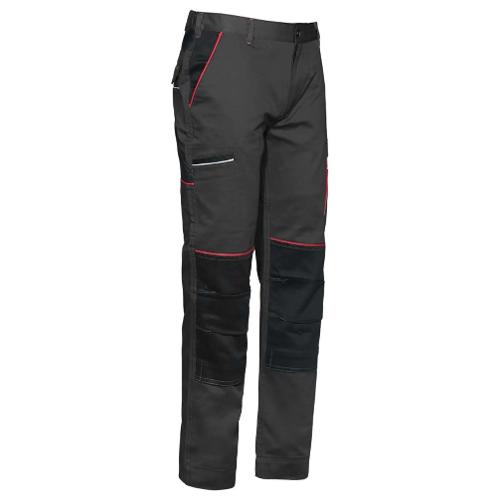 Pantalone da lavoro dotato di due tasche frontali, un tascone su gamba sinistra, una tasca porta telefono frontale a scomparsa, due tasche posteriori ed una tasca porta metro. Altre caratteristiche del capo sono l’elastico in vita che assieme al tessuto elasticizzato esaltano il comfort del pantalone mentre il rinforzo posteriore e le porta ginocchiere ne aumentano la resistenza. Tre piping riflettenti offrono una visibilità nei casi di scarsa visibilità (dove non sia richiesto un prodotto certificato en20471).