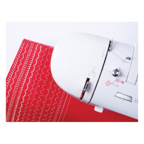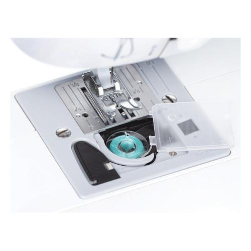 Macchina per cucire meccanica. 23 punti: 6 utili, 4 elasticizzati e 12 decorativi. Occhiellatore a 4 tempi. Bobina con inserimento dall’alto con percorso facilitato. Leva abbassa griffa. Infilatura automatica dell’ago. Punti flexi. Luci LED.