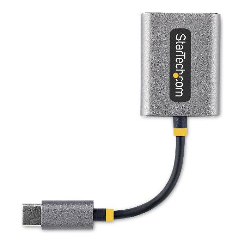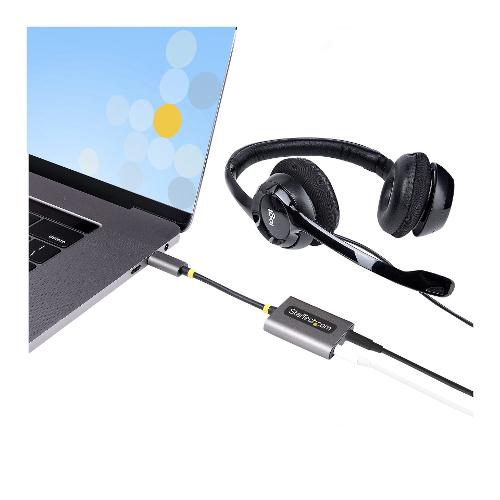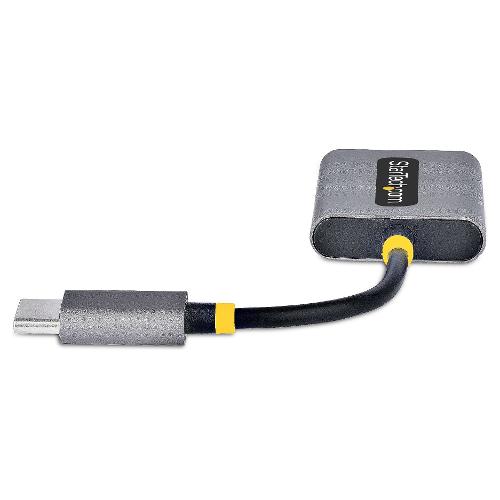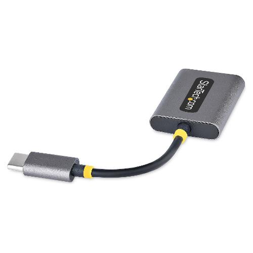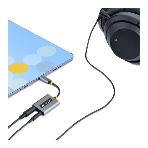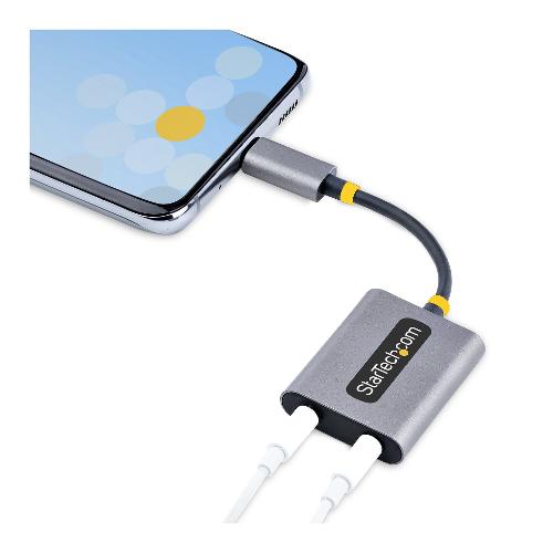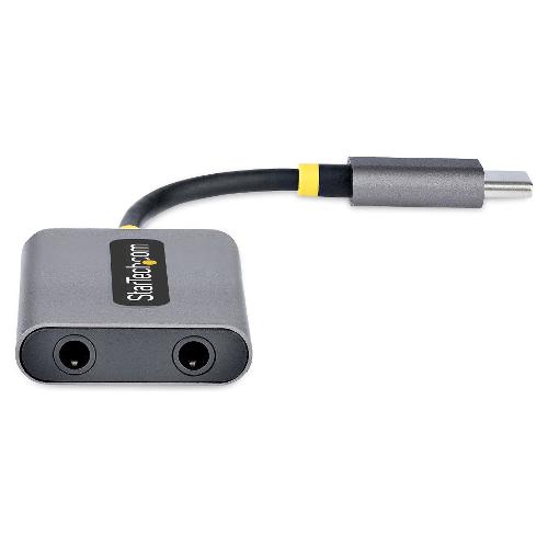 Questo splitter audio USBC-AUDIO-SPLITTER fornisce due connessioni audio per cuffie da 3,5 mm. Le porte da 3,5 mm accettano connettori TRRS da 3,5 mm a 4 poli e supportano l'uscita audio stereo simultanea e l'ingresso per cuffie/microfono. L'adattatore dispone anche di un cavo USB-C integrato da 7 cm.
