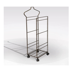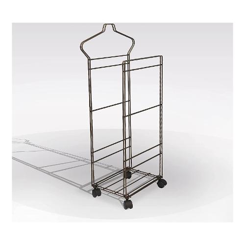 Servomuto doppio per camera da letto realizzato in metallo verniciato e munito di quattro pratiche rotelle che ne consentono lo spostamento dalla stanza alla lavanderia. Caratterizzato da un design moderno e stilizzato, questo indossatore originale è completo di staffe tubolari per i pantaloni e di una gruccia funzionale dove appoggiare giacche e camicie, mantenendole sempre ben stirate. La struttura minimalista integra un comodo ripiano per sistemare scarpe, ciabatte e pantofole.