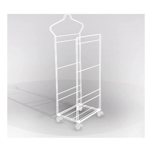 Servomuto doppio per camera da letto realizzato in metallo verniciato e munito di quattro pratiche rotelle che ne consentono lo spostamento dalla stanza alla lavanderia. Caratterizzato da un design moderno e stilizzato, questo indossatore originale è completo di staffe tubolari per i pantaloni e di una gruccia funzionale dove appoggiare giacche e camicie, mantenendole sempre ben stirate. La struttura minimalista integra un comodo ripiano per sistemare scarpe, ciabatte e pantofole.