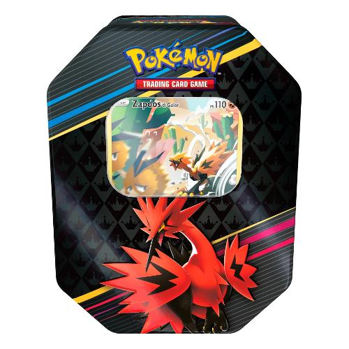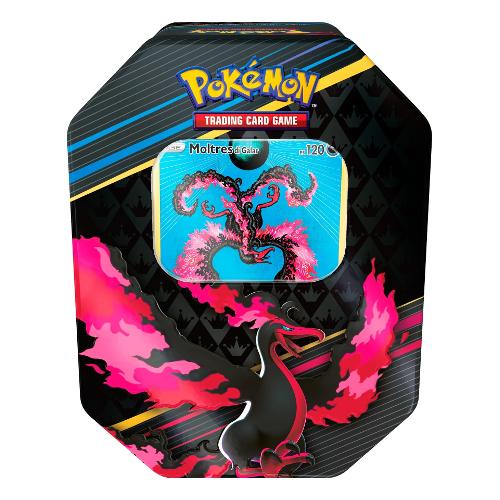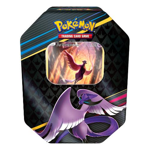 La Tin da Collezione Zenit Regale del GCC Pokémon contiene: 1 carta promozionale di Moltres di Galar-V/ Articuno di Galar-V o Zapdos di Galar-V 4 buste dell’espansione Zenit Regale del GCC Pokemon 1 carta codice per il GCC Pokemon Live
