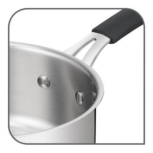 Casseruola con manicatura in silicone antiscivolo e fondo lagotherm triplo strato acciaio-alluminio-acciaio . Lo strato di alluminio permette al calore di diffondersi in maniera uniforme su tutto il fondo.