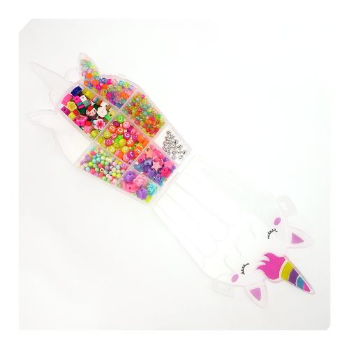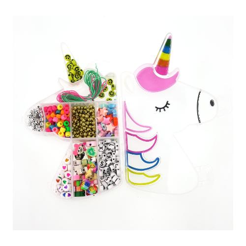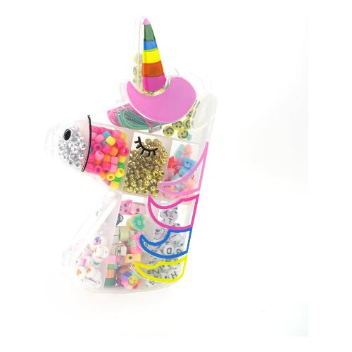 Set da portare con sé a forma di unicorno (in tre versioni diverse) con perle colorate a forma di stelle, perle dorate e argentate, clindretti, fiori, cuori, lettere e sagome varie in fymo.