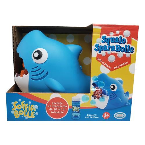 Squalo con girandola sparabolle con incluso 1 flacone da 50ml di soluzione. Funzionamento con 2 batterie stilo (aa) 1,5v non incluse