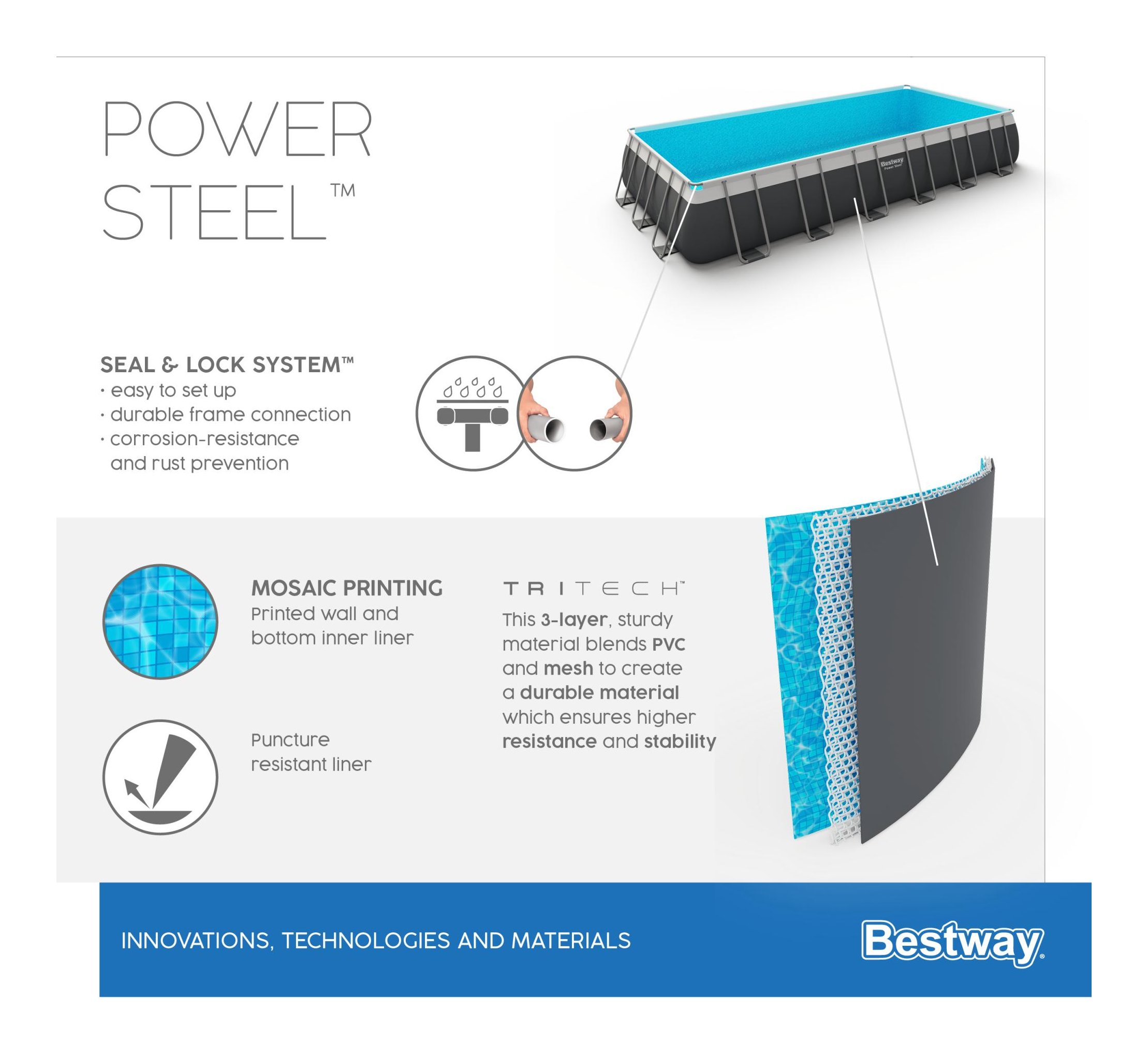 Le piscine power steel sono state progettate per avere una maggiore resistenza e per durare a lungo, grazie all’avanzato sistema seal&lock che evita la frizione tra parti metalliche e la creazione di ruggine nelle connessioni.