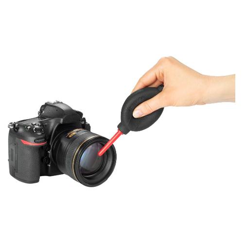 Un soffiatore d'aria consente una pulizia delicata delle fotocamere. Crea un potente soffio d'aria che espelle gli accumuli di polvere dalle aree sensibili della fotocamera senza bisogno di alcun contatto fisico.