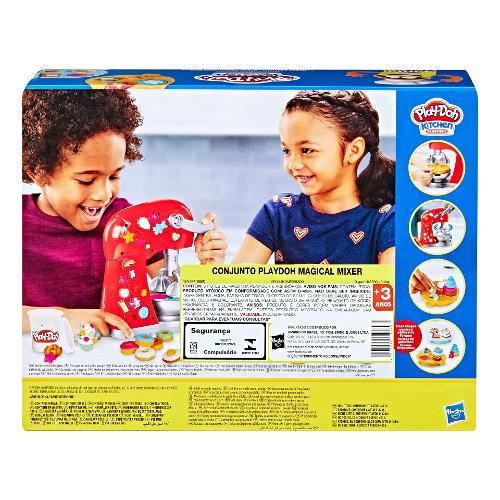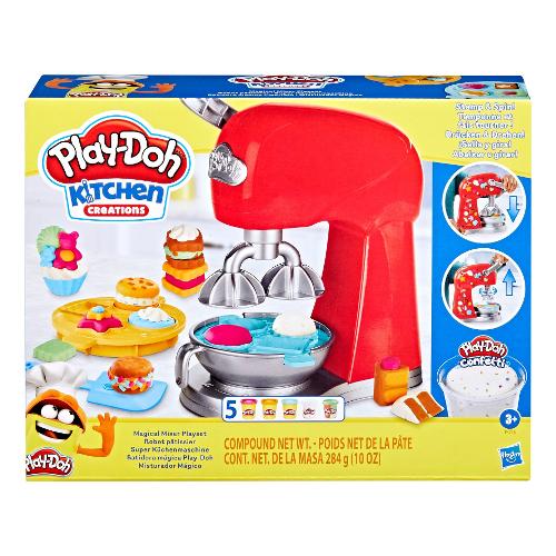 Crea fantastiche torte, cupcake e biscotti finti con il magico mixer di play-doh kitchen creations! Gli aspiranti pasticcieri possono fingere di infornare dolci posizionando 1 dei 2 stampini a forma di vassoio nella ciotola rimovibile, riempiendo ogni stampino con pasta modellabile play-doh e tirando l'impugnatura per creare biscotti stravaganti e buffe forme di torte! Aggiungi una spirale di melassa con l'estrusore o la spatola, produci confettini finti attraverso i buchi nell'impugnatura della spatola e crea ancora più caramelle, guarnizioni e decorazioni di pasta play-doh con gli stampi al lato dell'impastatrice giocattolo. Questo playset play-doh include 283 g di pasta modellabile atossica in diversi colori ed è un fantastico giocattolo per attività manuali da regalare a bambini e bambine dai 3 anni in su che adorano i giocattoli a tema cucina. Hasbro, play-doh e tutte le proprietà correlate sono marchi commerciali di hasbro. La confezione include: include 5 barattoli da 56 gr pasta modellabile colori assortiti e stampini vari
