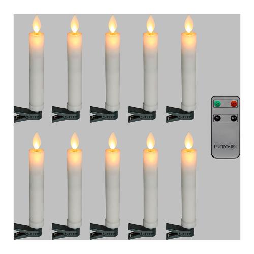 Set 10 candele con clip per albero ø1,85xh10cm plastica bianca finitura satinata matt led bianco caldo, fiamma in movimento con stoppino wick moving flame, telecomando ir on-off timer 6-8 ore on max 3m (batterie incluse), a batteria 1xaa (non inclusa), uso portatile esterno e interno