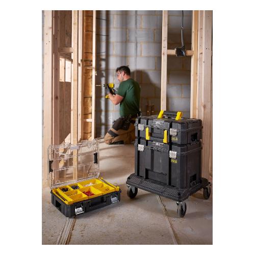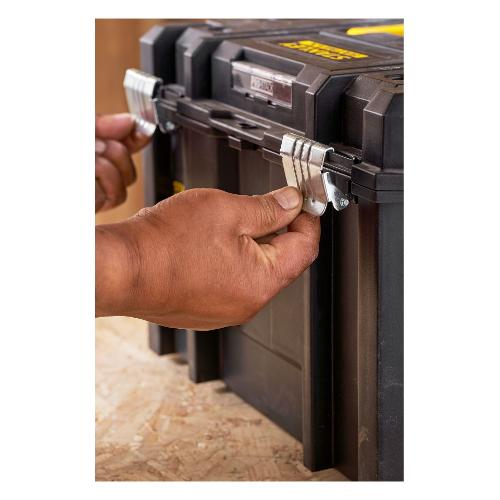 Cassetta gran volume modulare agganciabile e sovrapponibile con vaschetta estraibile, impugnatura e cerniere per uso intenso.Agganci Laterali per trasportare e sovrapporre gli elementi con facilità