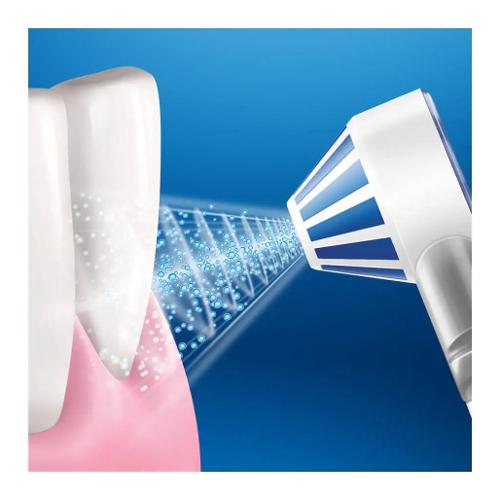 L’idropulsore Oral-B con tecnologia Oxyjet genera nell’acqua microbollicine di aria purificata per aiutare a migliorare la salute delle gengive con un delicato massaggio gengivale. Può essere usato anche con il collutorio per rinfrescare l’alito e combattere i batteri.