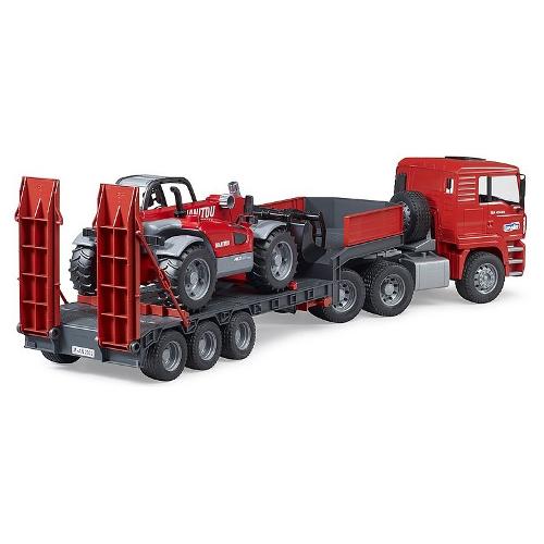 Per i trasporti pesanti, come ad esempio il trasporto di grandi macchinari edili da un cantiere all'altro, vengono spesso utilizzati rimorchi a pianale ribassato. Nel mondo BRUDER, il semirimorchio a pianale ribassato MAN TGA trasporta un Manitou MT633 fino al prossimo luogo d'impiego. Questo imponente veicolo dispone delle note caratteristiche del semirimorchio a pianale ribassato MAN, come il giunto a ralla del semirimorchio completamente funzionante, i supporti ribaltabili e le rampe di accesso mobili. Il caricatore telescopico articolato in dotazione è dotato di un braccio telescopico retrattile e regolabile in altezza e di una benna rimovibile.