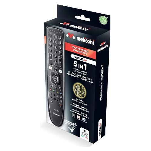 Telecomando universale 5 in 1 con corpo in gomma e tastiera retroilluminata, compatibile con TV, Decoder, SKY, Bluray/DVD ed altro. Tutte le funzioni originali disponibili. Aggiornabile via web. Funzione Learn.