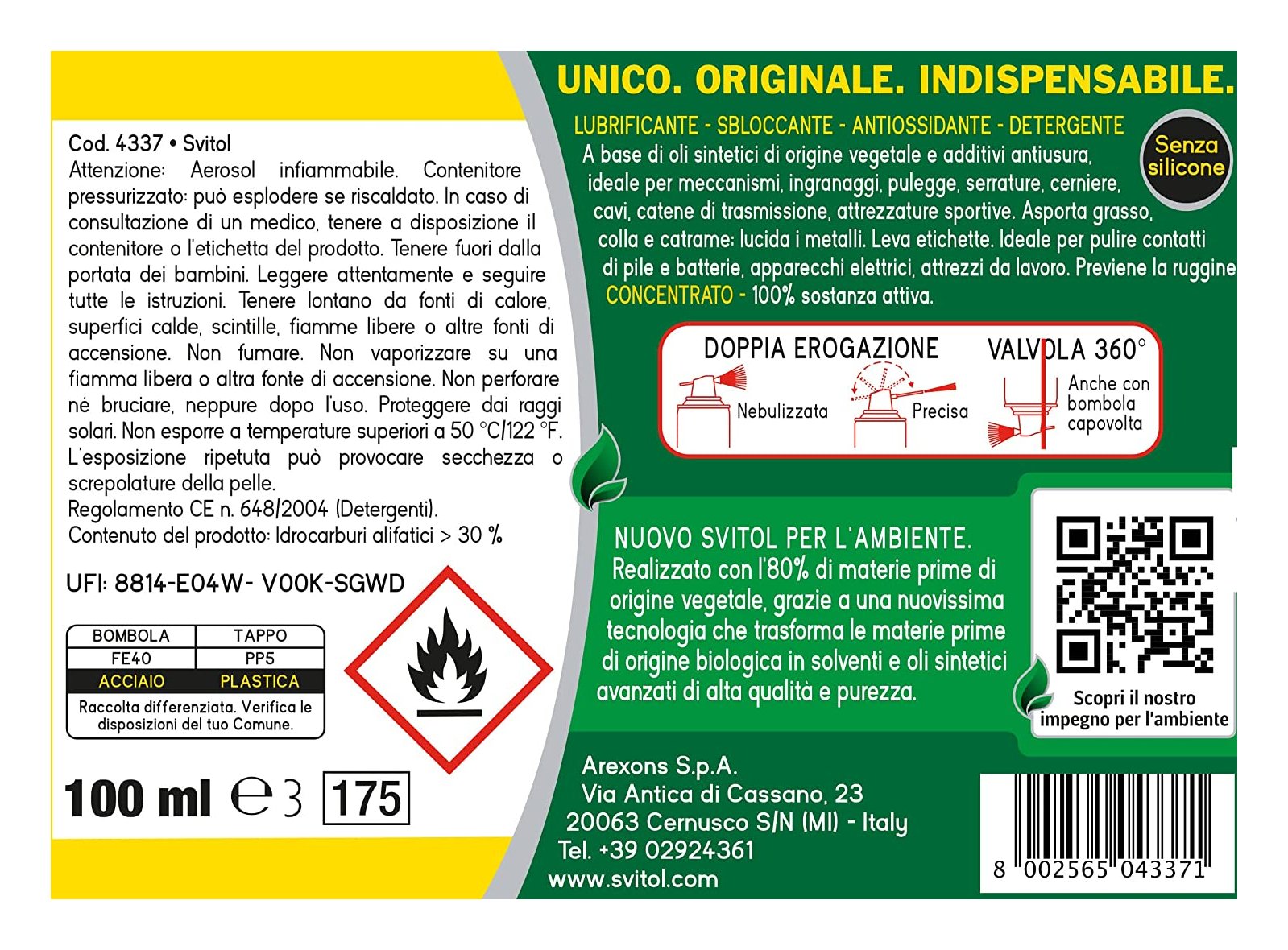 Lubrificante è a base di oli sintetici di origine vegetale e additivi antiusura, Realizzato con l’80% di materie prime di origine vegetale, grazie a una nuovissima tecnologia che trasforma le materie prime di origine biologica in solventi e oli sintetici avanzati di alta qualità e purezza. ideale per meccanismi, ingranaggi, pulegge, serrature, cerniere, cavi, catene di trasmissione, attrezzature sportive. Asporta grasso, colla e catrame; lucida i metalli. Leva etichette. Ideale per pulire contatti di pile e batterie, apparecchi elettrici, attrezzi da lavoro. Previene la ruggine.