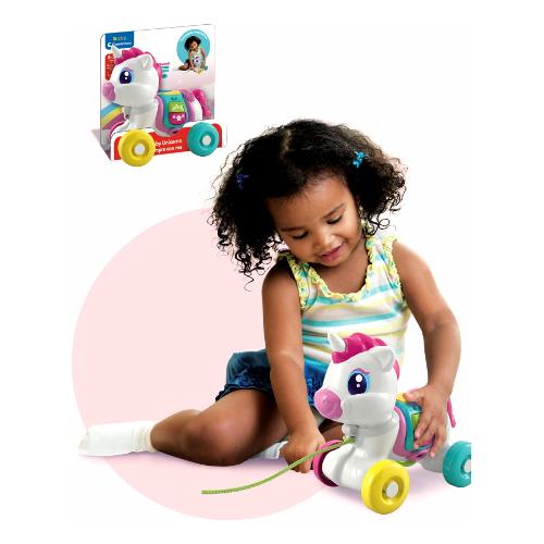 Un dolcissimo unicorno trainabile da portare sempre con sé. Attraverso i tasti sulla sella il simpatico unicorno prende vita, mangia, ride, e fa divertire il piccolo con effetti sonori e canzoncine. Grazie ai tasti interattivi, alle ruote ed il cordino, l'unicorno supporta lo sviluppo sensoriale, motorio e del linguaggio. Un personaggio iconico della linea baby clementoni e amatissimo dalle bambine. Made in italy.